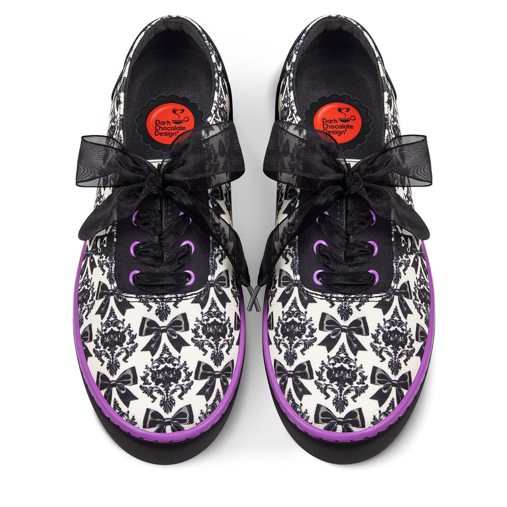 - Striking black-and-white printed fabric upper with bold gothic bow pattern