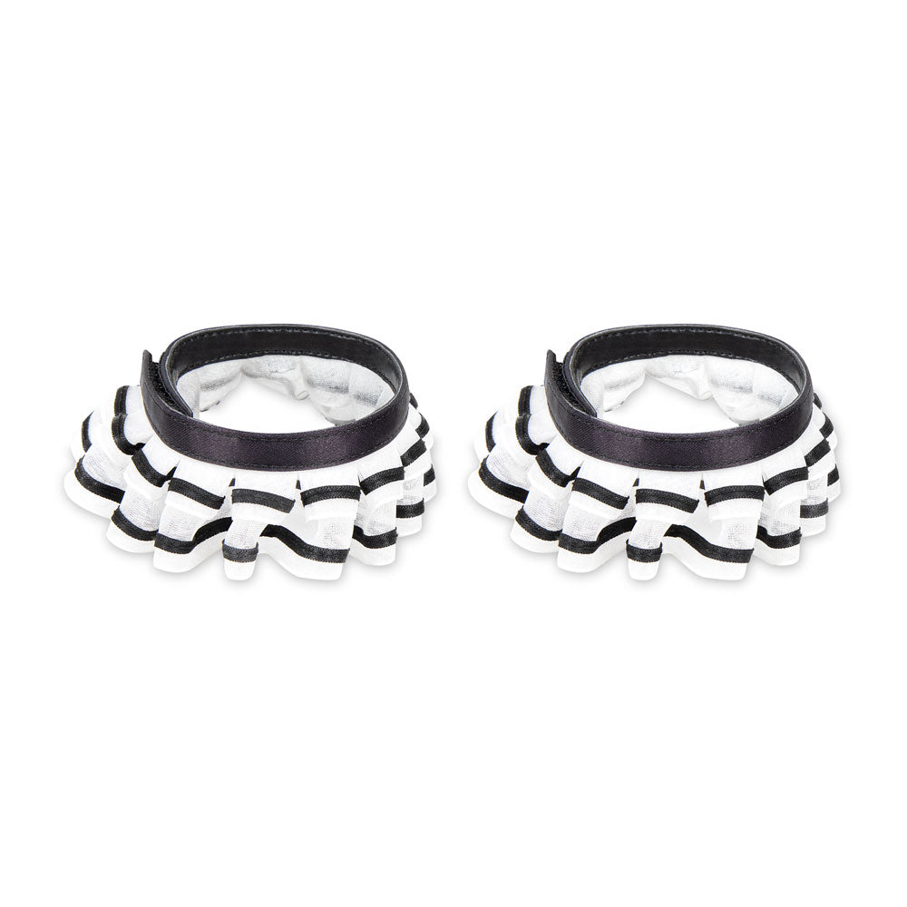 - Satin-finish fabric with printed details and ruffled trim